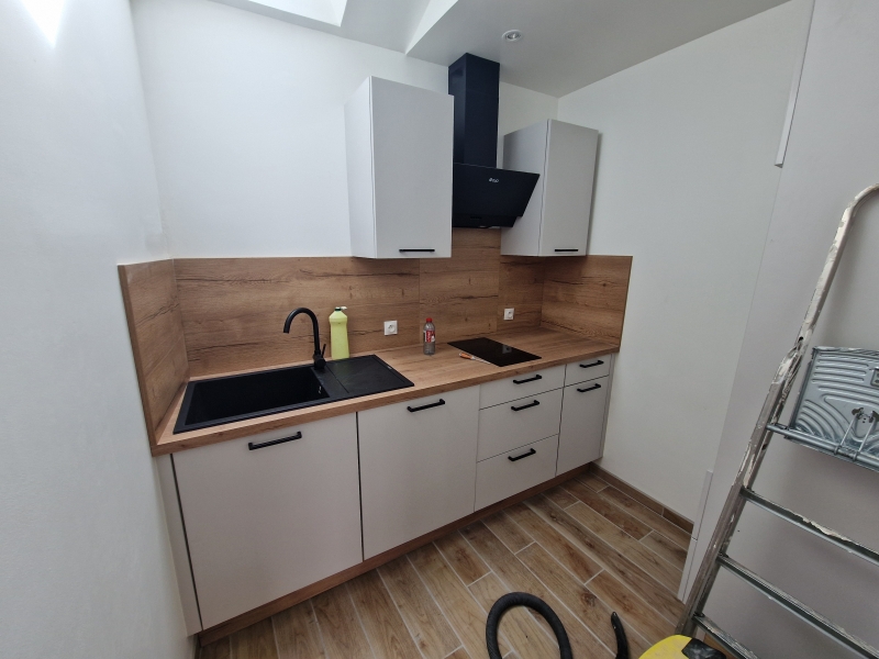 Dans un petit immeuble, avec entrée indépendante, appartement d'environ 60 m² : RDC : entrée / séjour / cuisine aménagée ouverte.